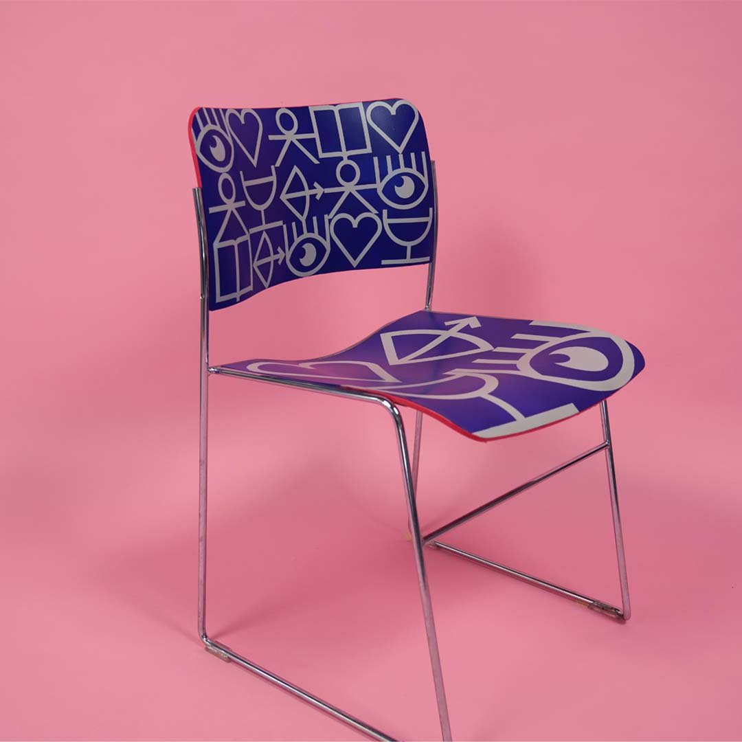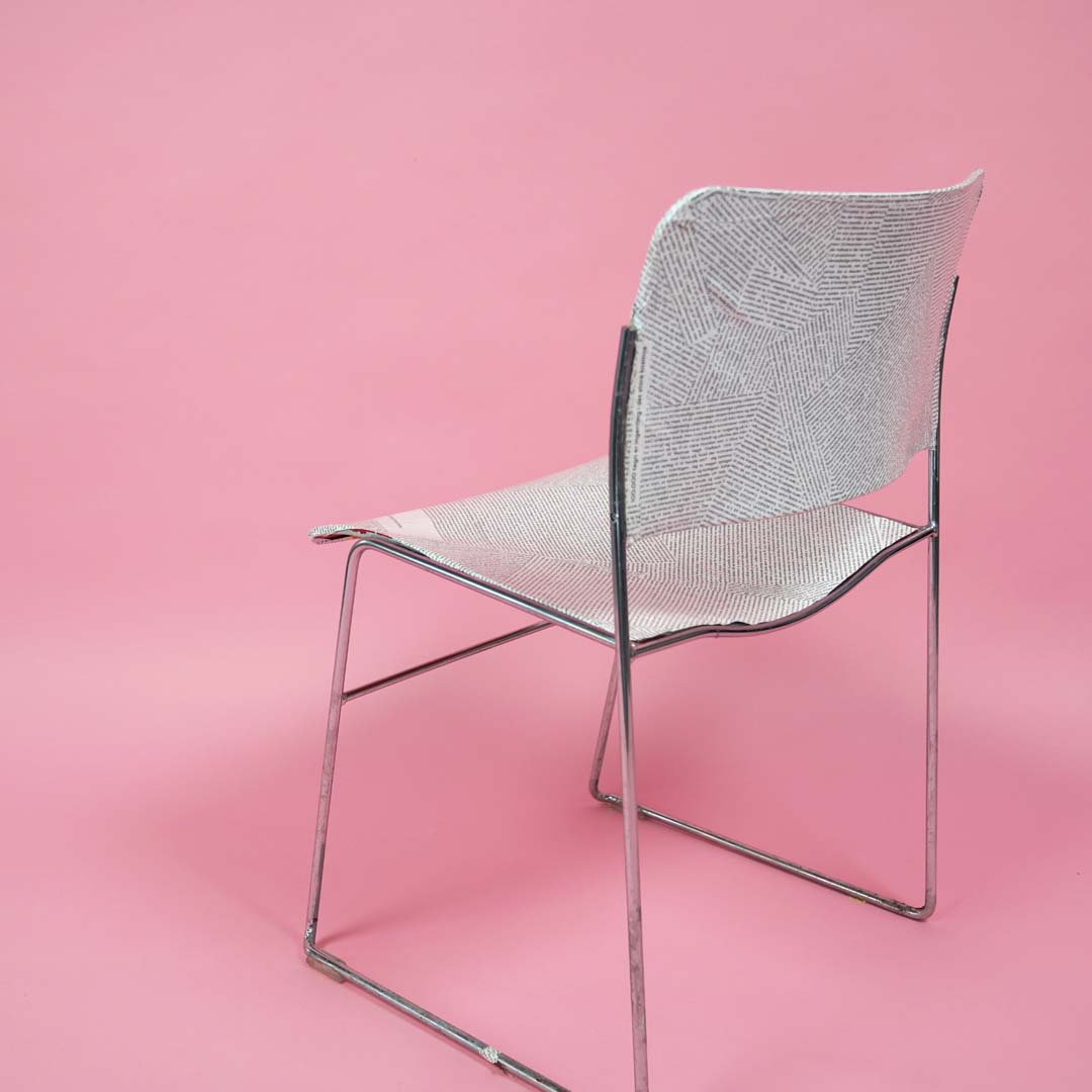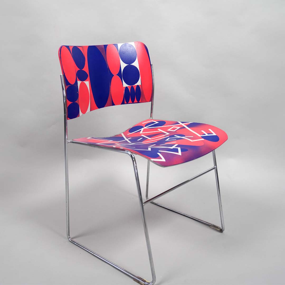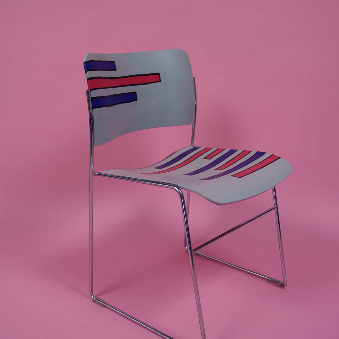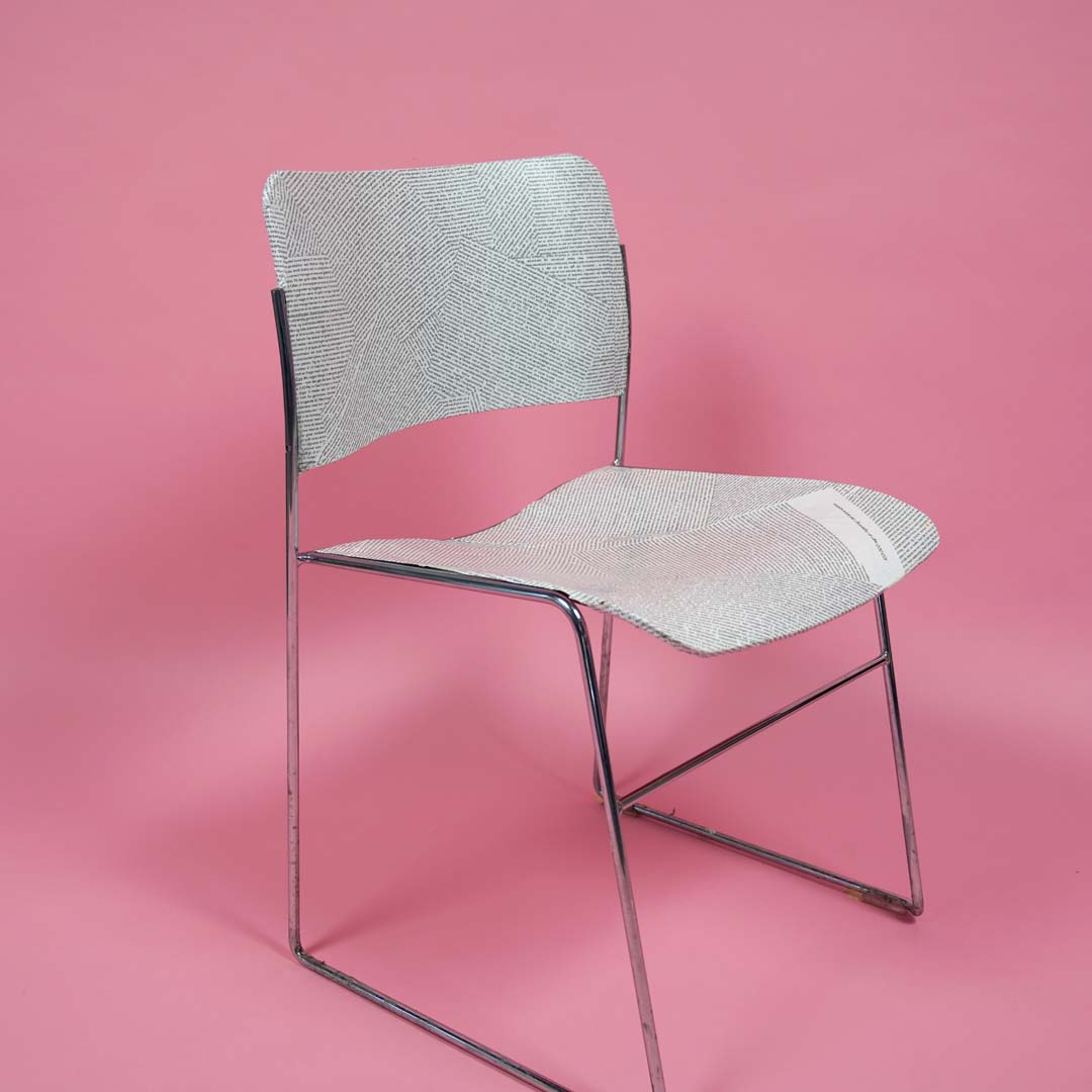 Stolene, der agerede lærred til vores kreative udskejelser, var ikke bare tilfældige stole. Vi havde fornøjelsen af at gentænke den amerikanske møbeldesigner David Rowlands berømte 40/4 stol. Stolens tidløse design er et af de mest banebrydende i det 20. århundrede, og stolen er solgt i over 8 millioner eksemplarer gennem dens 60-årige levetid. At bruges vores egen kreativitet til at udsmykke et stykke historisk kreativitet, syntes vi kun var passende.