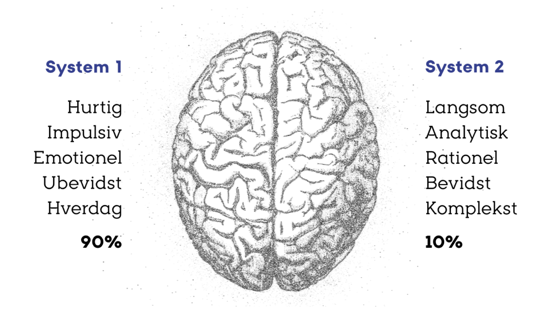 Du kender måske teorien om hjernens system 1 og 2, som nobelprisvinderen Daniel Kahneman omtaler i sin bog "Thinking - Fast and Slow". Kernen er, at vi mennesker i 90% af tiden tænker i system 1 - det impulsive, følelsesladede, umiddelbare stadie - og kun i 10% af tiden befinder os i system 2 - det rationelle, eftertænksomme og logiske stadie. Hvorfor nævner vi det i denne forbindelse?